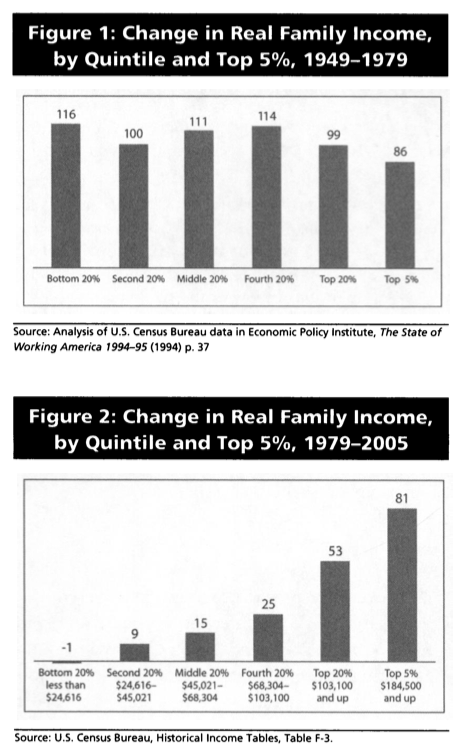 The following graphs illustrate the changes in income distribution in the decades following World War II, as well as after the great U-turn in the 1970’s.